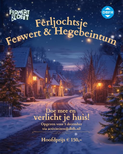 In het kader van de Bloeiweek roepen we iedereen in Ferwert en Hegebeintum op om hun huis te versieren met lichtjes. Zo maken we het samen gezellig in het dorp — en je kunt er ook nog een prijs mee winnen!